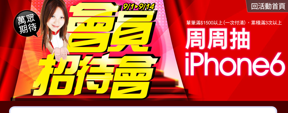 活動期間每周於全站(除企福網)消費,單筆滿$1500元以上(限一次付清),累積滿3筆以上,即有機會獲得iPhone6兌換券,每周抽1名(共2名,即9/1-9/7抽1名、9/8-9/14抽1名)。