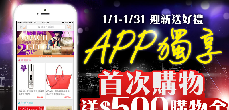 | 1/1-1/31 APP首次購物送500購物金 |