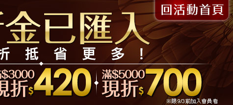 - 活動說明:限 2015/9/3 以前加入 GoHappy 會員者即可獲得現折購物金(折抵上限 14 %,現折購物金分別為 210 元 2 張、420 元 2 張、700 元 2 張),購物金於 2015/9/7 23:59 前匯入您的會員帳戶,您可至我的帳號 > 查詢購物金(抵用券)查看購物金明細。
